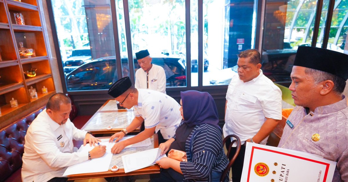 Kabarindoraya.com | Batu Bara - Bupati Batu Bara H. Baharuddin Siagian, S.H., M.Si., menandatangani Naskah Perjanjian Hibah Barang atas pelepasan sebagian lahan Hak Guna Usaha (HGU) serta Berita Acara Serah Terima Hibah antara PT Bakrie Sumatera Plantations Tbk dengan Pemerintah Kabupaten Batu Bara.