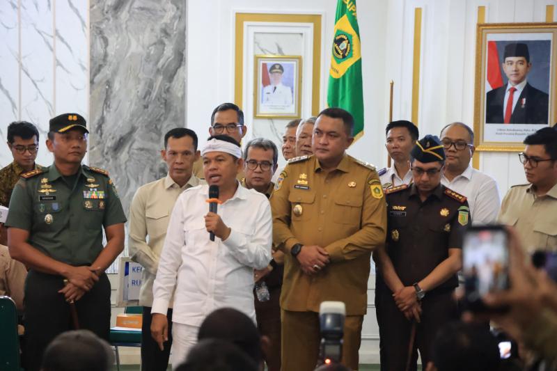 Kabarindoraya.com | Cibinong – Bupati Bogor, Rudy Susmanto mendampingi Gubernur Jawa Barat, Dedi Mulyadi bersilaturahmi dengan calon penerima Bantuan Masyarakat Desa Terdampak Pengaturan Pembatasan Kegiatan Tambang dan Operasional Angkutan Barang di wilayah Kecamatan Parung Panjang, Cigudeg, dan Rumpin. Kegiatan berlangsung di Ruang Serbaguna 1, Setda Kabupaten Bogor, Senin (3/11/25).