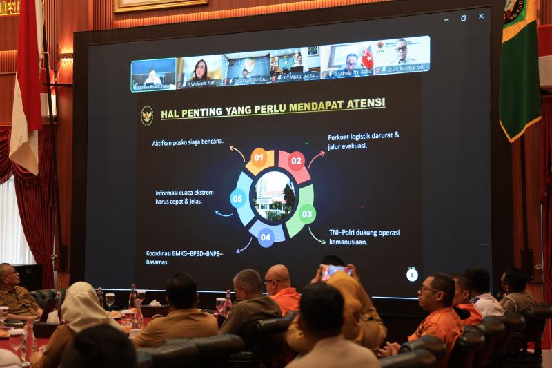 Kabarindoraya.com | Cibinong- Bupati Bogor, Rudy Susmanto, bersama Forum Koordinasi Pimpinan Daerah (Forkopimda) serta jajaran Pemerintah Kabupaten Bogor, mengikuti Rapat Koordinasi Pusat dan Daerah yang dipimpin Menteri Dalam Negeri Republik Indonesia, Tito Karnavian, secara virtual dari Ruang Soekarno Hatta, Pendopo Bupati Bogor, pada Senin (1/12/25). Rakor ini digelar untuk memastikan kesiapsiagaan nasional dalam menghadapi potensi bencana, serta persiapan pengamanan perayaan Natal 2025 dan Tahun Baru 2026 (Nataru).