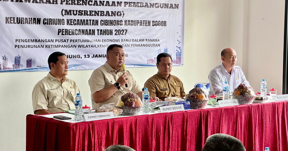 Kabarindoraya.com | Cibinong – Bupati Bogor, Rudy Susmanto tegaskan komitmen Pemerintah Kabupaten Bogor dalam penanganan banjir dan penguatan penghijauan wilayah saat menghadiri Musyawarah Perencanaan Pembangunan (Musrenbang) Kelurahan Ciriung, Kecamatan Cibinong, Selasa (13/1).