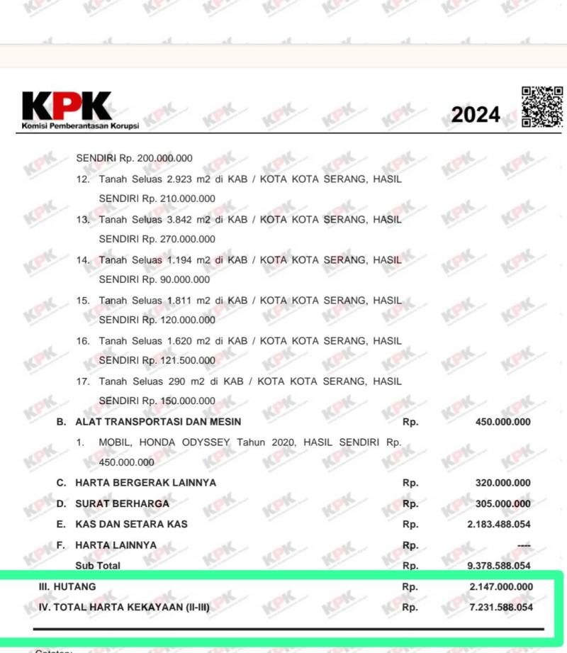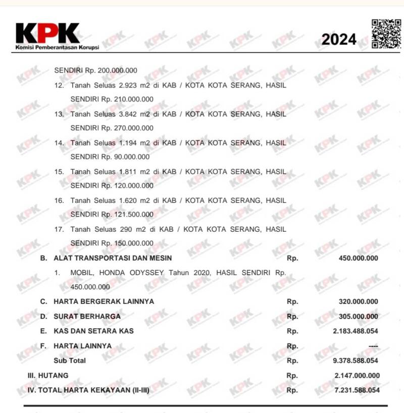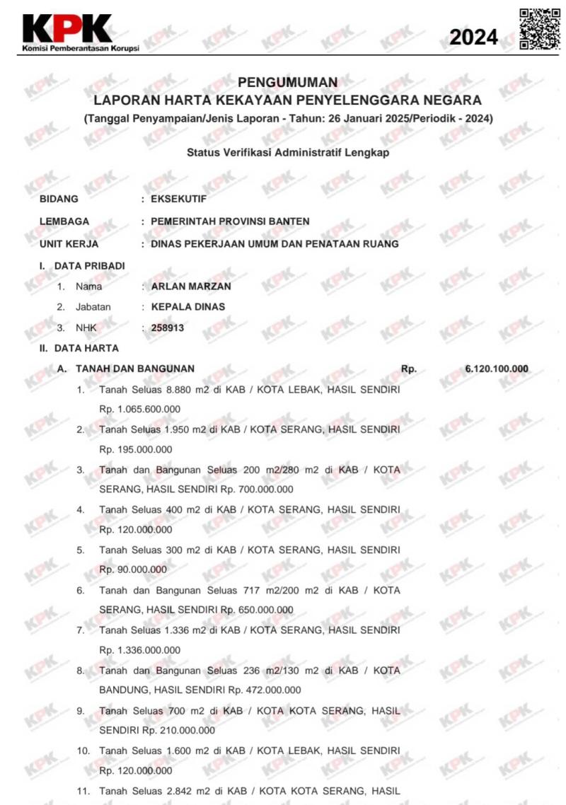 Berdasarkan penelusuran dokumen LHKPN 2024, Arlan masih tercatat memiliki tanah dan bangunan di wilayah Tangerang Selatan dan Serang senilai Rp5,8 miliar, alat transportasi sekitar Rp750 juta, serta kas dan setara kas Rp600 juta.