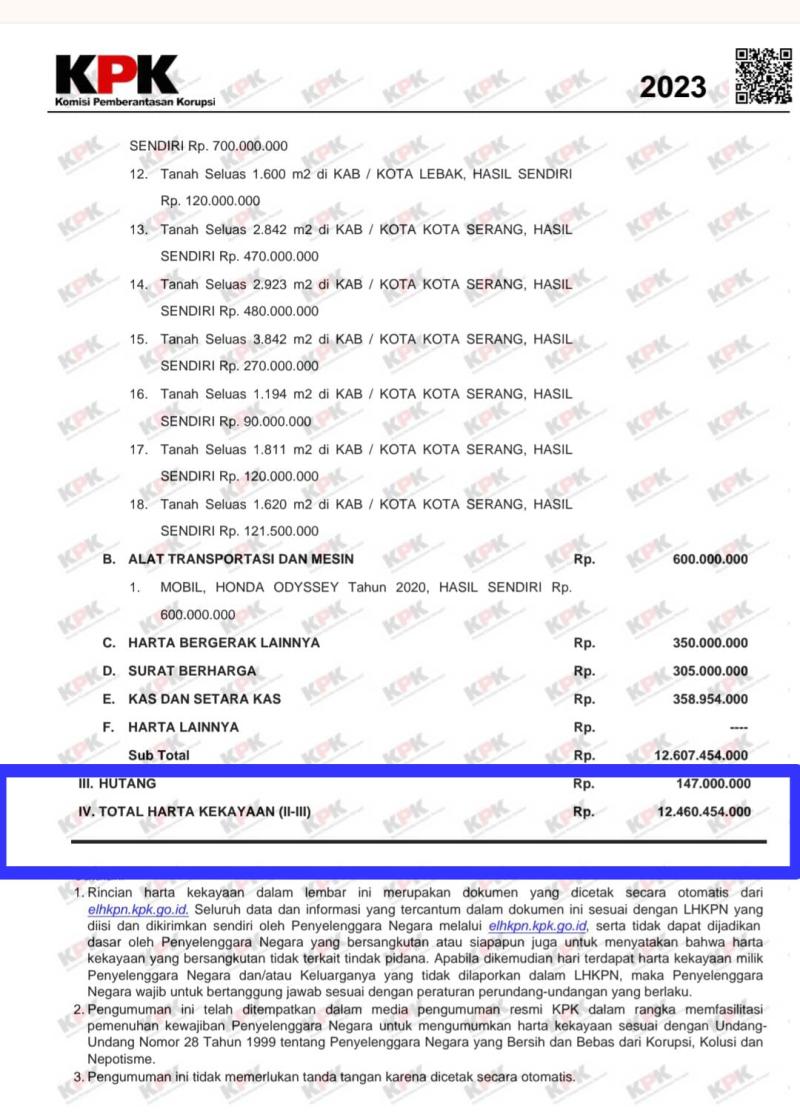 Yang lebih menarik perhatian, jumlah kekayaan Arlan tercatat lebih besar daripada Gubernur Banten, yang hanya memiliki Laporan Kekayaan sekitar Rp. 3,3 miliar pada periode sama.