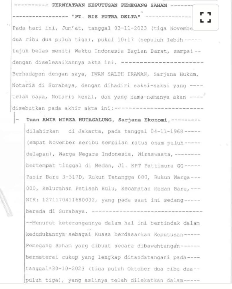Forum Aktivis menilai proses pengadaan proyek itu sarat kejanggalan. Berdasarkan dokumen resmi, akta perubahan direksi PT Ris Putra Delta dibuat pada 3 November 2023, menempatkan Amir Mirza sebagai direktur baru.