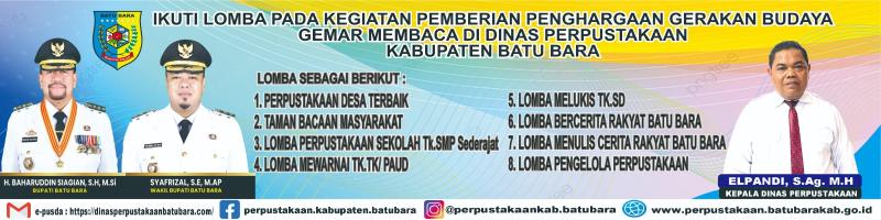 Adapun lomba gemar membaca ini adalah, " perpustakaan desa terbaik, taman bacaan terbaik,lomba perpustakaan TK sederajat, lomba mewarnai TK/TK/ PAUD,lomba melukis tingkat SD, lomba bercerita rakyat Batu Bara,lomba pengelolaan perpustakaan," jelas Maya Sukanty.