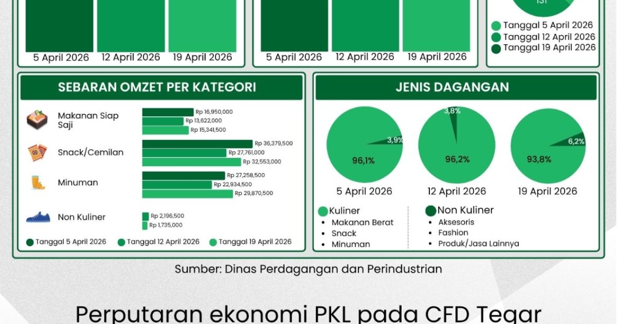 Dari sisi ekonomi, CFD Tegar Beriman mencatat performa yang sangat impresif. Berdasarkan data Dinas Perdagangan dan Perindustrian, perputaran uang dari aktivitas Pedagang Kaki Lima (PKL) mencapai puncaknya pada 19 April 2026 dengan omzet sebesar Rp 90,7 juta. Angka tersebut meningkat tajam dibandingkan pekan sebelumnya yang berada di kisaran Rp 66,5 juta. Kenaikan ini juga berdampak langsung pada pendapatan pedagang, dengan rata-rata omzet individu menyentuh Rp 697 ribu.
