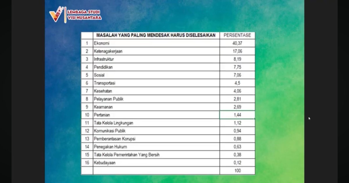 Keamanan berada diangka 84,44% dan Hukum berada di angka 79,75%. Kemudian pemberantasan Korupsi, mendapat nilai positif sebesar 79,38% dan transportasi diangka 74,25%.