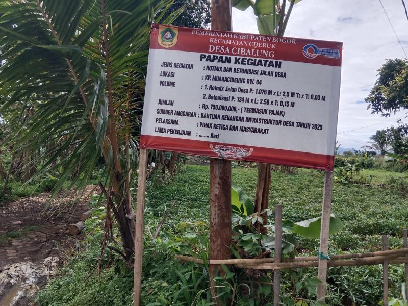Kabarindoraya.com | Bogor - Kegiatan pembangunan jalan desa yang berasal dari anggaran bantuan keuangan (Bankeu) Pemerintah Kabupaten (Pemkab) Bogor tahun 2025 di Desa Cibalung, Kecamatan Cijeruk, diduga asal-asalan. Sebab, proyek bersumber dana dari APBD II dengan sebutan program Satu Miliar Satu Desa (Samisade) yang dialokasikan pembangunan nya untuk hotmix dan betonisasi jalan desa di Kampung Muaracideung RW 04, disinyalir tidak sesuai Rencana Anggaran Belanja (RAB).