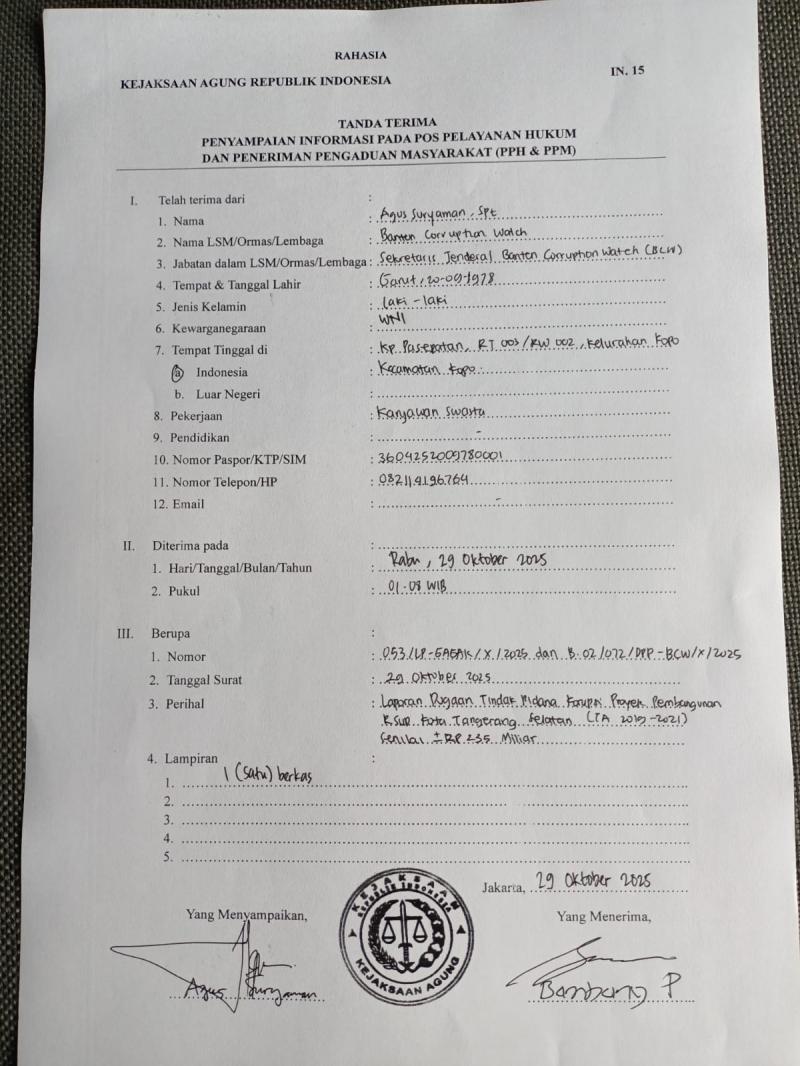 BCW bersama Gabungan Gerakan Anti Korupsi (GAGAK) telah melaporkan dugaan tindak pidana korupsi proyek RSU Tangsel ke Kejaksaan Agung RI.