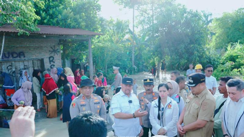 Dalam kunjungan itu, Bupati bersama Wakil Bupati, Kapolres, dan Bendahara DPD Partai Gerindra Sumatera Utara beserta rombongan juga menyalurkan bantuan kepada masyarakat yang terdampak banjir.
