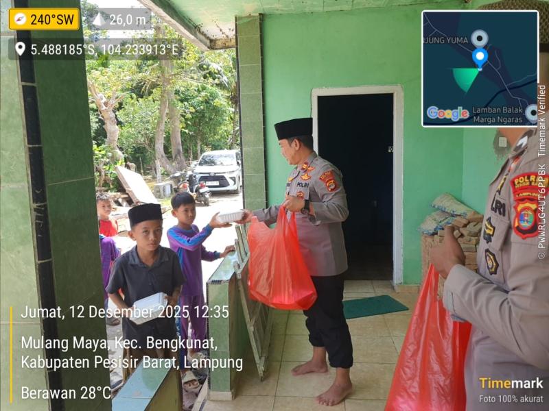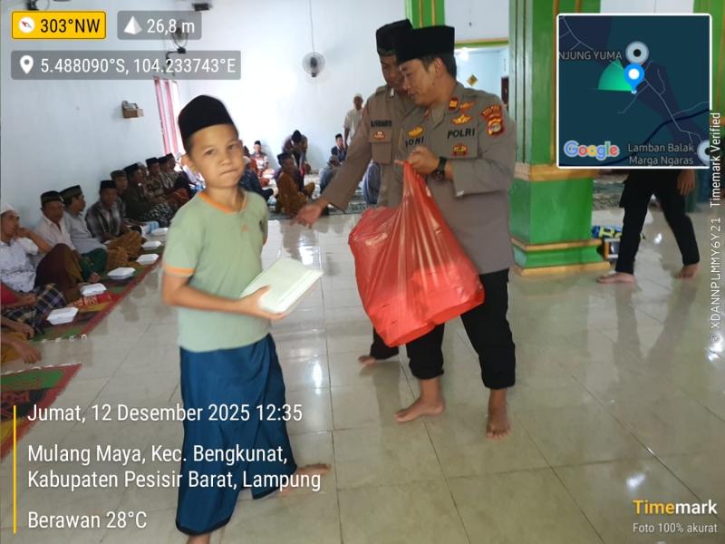 Kabarindoraya.com | Krui Pesisir Barat – Polsek Bengkunat melaksanakan kegiatan Jumat Keliling sebagai upaya mendekatkan diri dengan masyarakat, Jumat (12/12/2025). Kegiatan ini berlangsung di Masjid Al-Arif, Pekon Mulang Maya, Kecamatan Ngaras, Kabupaten Pesisir Barat.