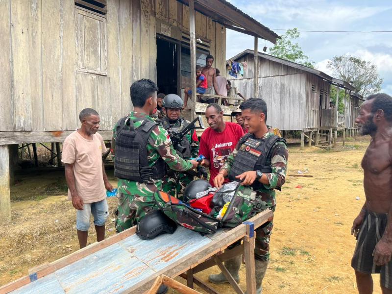 Kabarindoraya.com | Asmat, Koroway — Di sela-sela pelaksanaan tugas patroli rutin, Satgas Yonif 123/Rajawali Pos Koroway menggelar kegiatan bakti sosial berupa pembagian sembako dan pelayanan kesehatan gratis untuk masyarakat Kampung Mabul, Distrik Koroway, Kabupaten Asmat pada Jumat (28/11/2025).